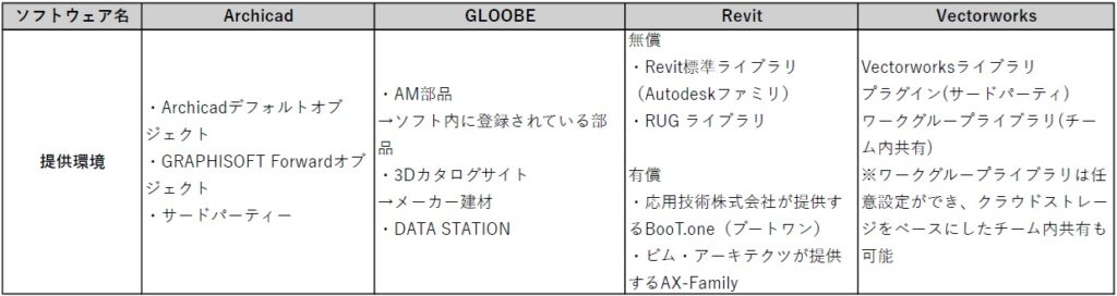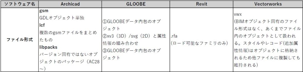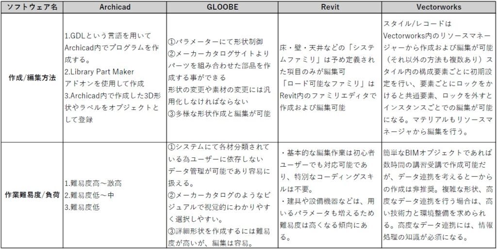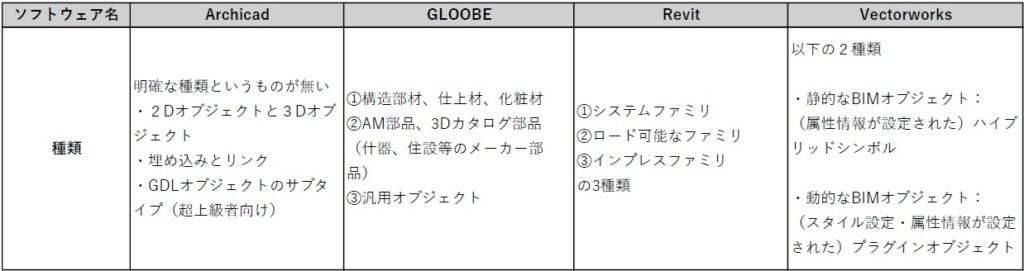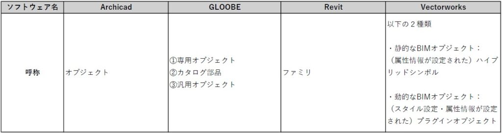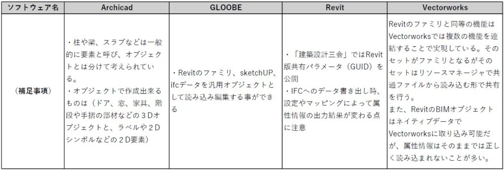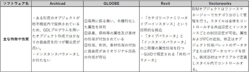 4つのBIMソフトウェアのオブジェクト概要整理表
