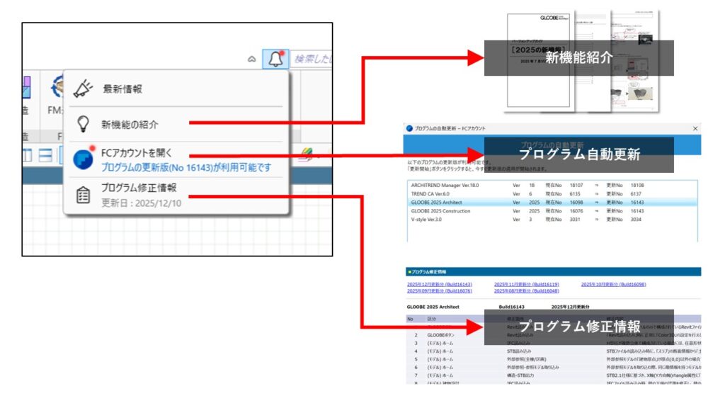 - GLOOBE内のお知らせ機能から、上記「新機能紹介」や「最新の更新版の通知」、「プログラム修正情報(ビルドごとの修正項目)」への案内を行います。