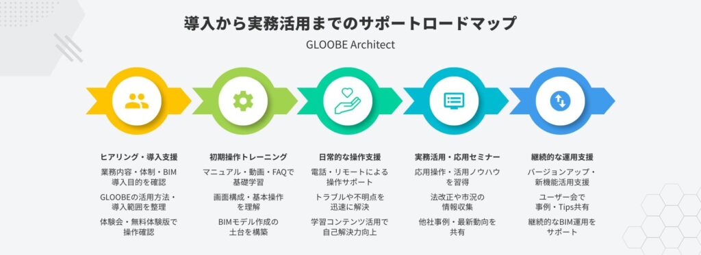 | 1. ヒアリング・導入支援 | 業務内容や体制、BIM導入の目的をヒアリングし、GLOOBEの活用方法や導入範囲を整理します。製品や導入に関する不明点は、専用フォームからの問い合わせに加え、全国の営業拠点担当者へ直接相談し、実際にGLOOBEをご覧頂きながら、内容の確認をして頂くことが可能です。無料体験会への参加や体験版を通じて、導入前に操作感や機能を確認できます。 |